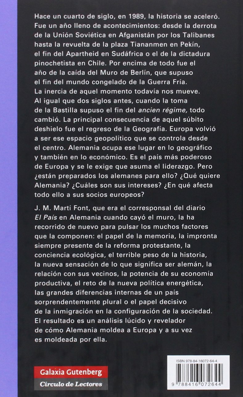 Hace un cuarto de siglo, en 1989, la historia se aceleró. Fue un año lleno de acontecimientos: desde la derrota de la Unión Soviética en Afganistán por los Talibanes hasta la revuelta de la plaza Tiananmen en Pekín, el fin del Apartheid en Sudáfrica o el de la dictadura pinochetista en Chile. Por encima de todo fue el año de la caída del Muro de Berlín, que supuso el fin del mundo congelado de la Guerra Fría. La inercia de aquel momento todavía nos mueve. Al igual que dos siglos antes, cuando la toma de la Bastilla supuso el fin del ancien régime, todo cambió. La principal consecuencia de aquel súbito deshielo fue el regreso de la Geografía. Europa volvió a ser ese espacio geopolítico que se controla desde el centro. Alemania ocupa ese lugar en lo geográfico y también en lo económico. Es el país más poderoso de Europa y se le exige que asuma el liderazgo. Pero ¿están preparados los alemanes para ello? ¿Qué quiere Alemania? ¿Cuáles son sus intereses? ¿En qué afecta todo ello a sus socios europeos? J. M. Martí Font, que era el corresponsal del diario El País en Alemania cuando cayó el muro, la ha recorrido de nuevo para pulsar los muchos factores que la componen: el papel de la memoria, la impronta siempre presente de la reforma protestante, la conciencia ecológica, el terrible peso de la historia, la nueva sensación de lo que significa ser alemán, la relación con sus vecinos, la potencia de su economía productiva, el reto de la nueva política energética, las grandes diferencias internas de un país sorprendentemente plural o el papel decisivo de la inmigración en la configuración de la sociedad. El resultado es un análisis lúcido y revelador de cómo Alemania moldea a Europa y a su vez es moldeada por ella.