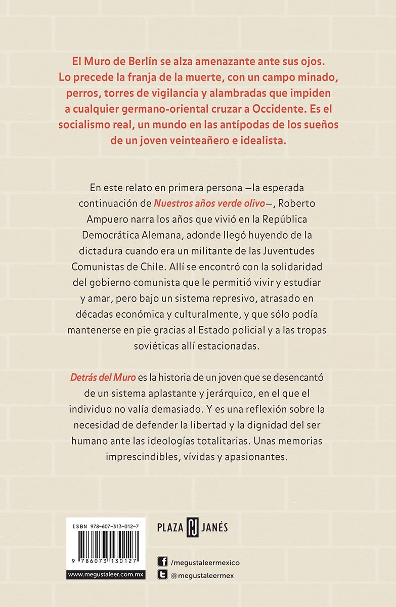 El Muro de Berlín se alza amenazante antes sus ojos. Lo precede la franja de la muerte, con un campo minado, perros, torres de vigilancia y alambradas que impiden a cualquier germano-oriental cruzar a Occidente. Es el socialismo real, un mundo en las antípodas de los sueños de un joven veinteañero e idealista. En este relato en primero persona la esperada continuación de Nuestros años verde olivo, Roberto Ampuero narra los años en que vivió en la República Democrática Alemana, adonde llegó huyendo de la dictadura chilena cuando era un militante de las JJCC de Chile. Allí se encontró con la solidaridad del gobierno comunista que le permitió vivir y estudiar y amar, pero asimismo, con un sistema represivo, atrasado en décadas económica y culturalmente, y que solo podía mantenerse en pie gracias al estado policial y a las tropas soviéticas allí estacionadas. Detrás del Muro es la historia de un joven que se desencantó de un sistema aplastante y jerárquico, en el que el individuo no valía demasiado. Y es una reflexión sobre la necesidad de defender la libertad y la dignidad del ser humano frente a las ideologías totalitarias.