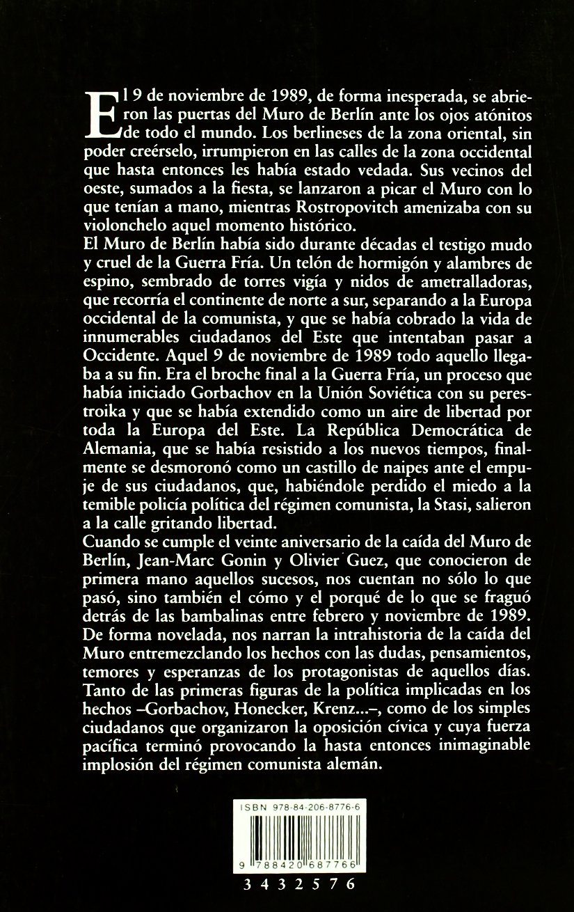Cuando se cumple el veinte aniversario de la caída del Muro de Berlín, Jean-Marc Gonin y Olivier Guez, que conocieron de primera mano aquellos sucesos, nos cuentan no sólo lo que pasó, sino también el cómo y el porqué de lo que se fraguó detrás de las bambalinas entre febrero y noviembre de 1989. De forma novelada, nos narran la intrahistoria de la caída del Muro entremezclando los hechos con las dudas, pensamientos, temores y esperanzas de los protagonistas de aquellos días. Tanto de las primeras figuras de la política implicadas en los hechos -Gorbachov, Honecker, Krenz…-, como de los simples ciudadanos que organizaron la oposición cívica y cuya fuerza pacífica terminó provocando la hasta entonces inimaginable implosión del régimen comunista alemán.