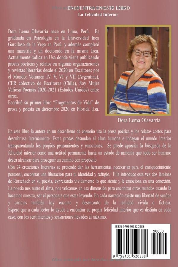 La autora decide buscar esa riqueza interna e invita a sus lectores arriesgarse a ser feliz en su interior, descubriéndose y narrando su propia prosa poética. Los relatos cortos te deleitaran por el uso de la imaginación y enseñanza de sus historias. Hallaras en la poesía muchos apegos y desapegos que te impactaran para encontrar esas satisfacciones personales en su búsqueda firme de alborozo. Con 24 creaciones literarias se pretende dar las herramientas necesarias para el enriquecimiento personal, encontrar una liberación para tu identidad y refugio. Ella agrega 11 prosas y relatos ya publicados en el 2020 y 2021 en otras Organizaciones literarias para que sus seguidores y publico pueda disfrutarlos a traves de codigo QR.