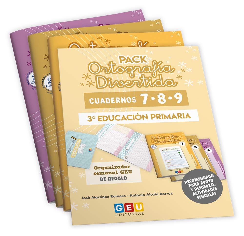 El pack ortografía divertida 3º de Educación primaria, incluye los cuadernos 7, 8 y 9. Estos tres cuadernos son el material perfecto para mejorar la ortografía estudiada en libros de texto. Aplica una metodología activa e inductiva. Las actividades parten de los ejemplos normativos concretos y cercanos al niño que concluyen con la deducción de la regla ortográfica a aprender. Recomendado para: niños de entre 8 y 9 años; enseñar de manera divertida y motivadora; ayudar al auto-aprendizaje; reforzar la autoestima con la superación de objetivos organizador semanal de regalo en el pack